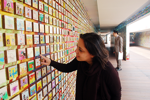 ▲ 브라질 ‘오 글르보’의 마리아나 필구에라스 데 소우자 기자가 18일 ‘2013 순천만정원박람회’의 ‘꿈의 다리’에서 전 세계 16개국 14만명의 어린이들이 그린 벽화를 보고 있다. (강진아 기자) |