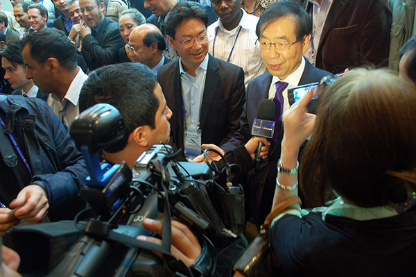 ▲ 19일 서울 중구 프레지던트 호텔 31층 슈베르트홀에서 열린 박원순 서울시장과의 만찬에서 페루 ‘파나메리카나TV’를 비롯한 각국의 기자들이 박 시장을 인터뷰하고 있다. (강진아 기자) |