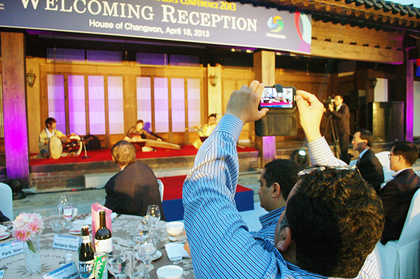 ▲ 18일 경남 창원시 ‘창원의 집’에서 창원국악관현악단이 싸이의 ‘강남스타일’을 재해석해 연주하고 있는 모습을 쿠웨이트의 아흐마드 바시르 기자가 카메라에 담고 있다. (양성희 기자) |