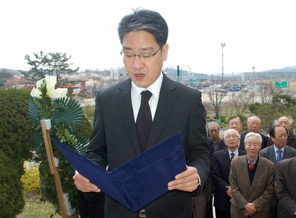 | ▲ 제36회 한국전 순직종군기자 추도식에서 한국기자협회 박종률 회장이 추도사를 읽고 있다. | ||