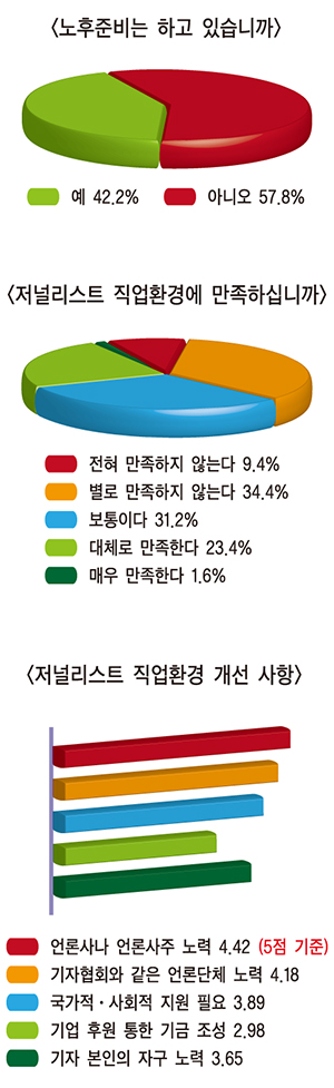 세계 기자들은 저널리스트 직업 환경에 만족하지 않고 있으며, 가장 주요한 이유로 ‘보수가 낮아서’라고 생각하는 것으로 나타났다. 또 절반이 넘는 기자가 노후 준비를 하지 못하고 있었다. 저널리스트 직업 환경 개선을 위해 언론사와 언론단체, 국가적·사회적 지원이 필요하다고 지적했다.