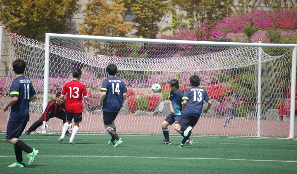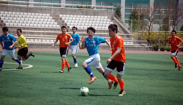 | ▲ 5일 경기도 고양시 별무리경기장에서 열린 16강전에서 중앙일보와 한국경제 선수들이 치열한 접전을 벌이고 있다. | ||