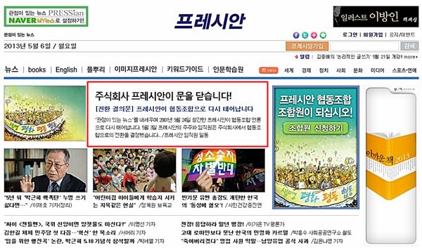| ▲ 6일 프레시안은 홈페이지에 '주식회사 프레시안이 문을 닫습니다!'란 제목으로 협동조합 전환 결의문을 실었다. | ||