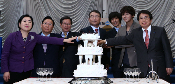 ▲ (서울=연합뉴스) 유용석 기자 = 10일 오후 서울 여의도 KBS 신관 로비에서 열린 '김인규의 드라마 스캔들 북콘서트'에서 김인규 KBS 전 사장(가운데)를 비롯한 내빈들이 축하 케이크를 자르고 있다. |