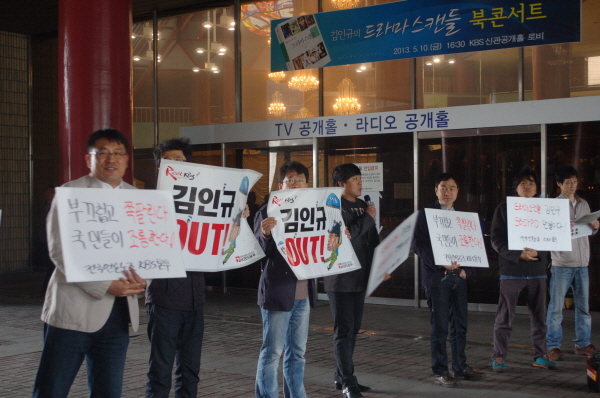 새노조는 이날 출판기념회가 열린 신관 공개홀 앞에서 “KBS 망쳐놓고 출판기념회 웬 말이냐”, “드라마스캔들 김인규, 드라마 PD 멘붕이다”, “낙하산 스캔들 김인규, 드라마스캔들 황당하다” 등의 구호를 외치며 피켓 시위도 벌였다.