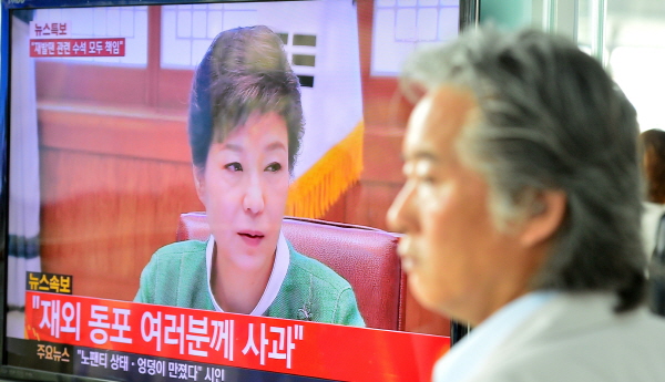 | ▲ 【서울=뉴시스】조종원 기자 = 박근혜 대통령이 미국 방문 중 벌어진 윤창중 전 대변인의 성추문 사태와 관련해 유감을 표명한 13일 오전 서울역 대합실에서 시민들이 관련 뉴스를 시청하고 있다. | ||