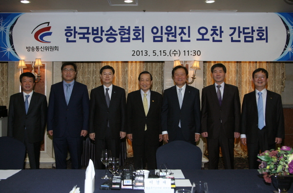 ▲ 이경재 방송통신위원장이 지상파 방송사를 대표하는 한국방송협회 임원진과 15일 여의도 렉싱턴호텔에서 간담회를 가졌다. 왼쪽부터 박재만 방송협회 사무총장, 김종국 MBC 사장, 길환영 KBS 사장, 이경재 방통위원장, 우원길 SBS 사장, 이재천 CBS 사장, 신용섭 EBS 사장. (방통위 제공) |