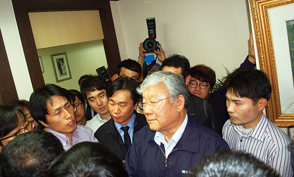 정상원 노조위원장 등 기자들은 “200억원 돌려놓고, 인사철회하고 물러나십시오”, “대주주 자격이 없지 않습니까”라며 맞섰다.