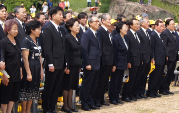 | ▲ 23일 오후 경남 김해시 진영읍 봉하마을 노무현 전 대통령 묘역에서 4주기 추도식이 거행됐다. 권양숙 여사와 민주당 문재인 이해찬 의원 등 참석자들이 임을 위한 행진곡을 제창하고 있다.(뉴시스) | ||