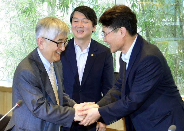 ▲ 【서울=뉴시스】최동준 기자 = 무소속 안철수 의원이 22일 오후 서울 마포구 서교동 한 카페에서 기자회견을 열고 '정책네트워크 내일'이라는 연구소를 창립한다고 밝혔다. 기자회견을 마치고 안철수 의원이 이사장인 최장집 고려대 명예교수, 소장인 장하성 전 안철수캠프 국민정책본부장과 인사를 나누고 있다. |