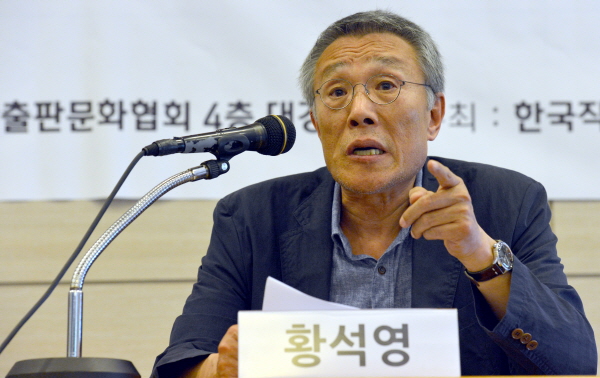 ▲ 【서울=뉴시스】김영욱 기자 = 23일 오전 서울 종로구 사간동 출판문화회관 내 대한출판문화협회에서 소설가 황석영 씨가 '출판계에 만연한 사재기 행태 근절 촉구 기자회견'을 열고 성명서를 발표하고 있다. |