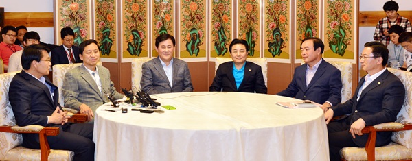 | ▲ 26일 서울 여의도 국회 의원동산 사랑재에서 열린 여야지도부 회담. 왼쪽부터 윤상현 새누리당 원내수석부대표, 김기현 새누리당 정책위의장, 최경환 새누리당 원내대표, 전병헌 민주당 원내대표, 장병완 민주당 정책위의장, 정성호 민주당 원내수석부대표가 6월 국회 일정 등 의견을 나누고 있다. (뉴시스) | ||