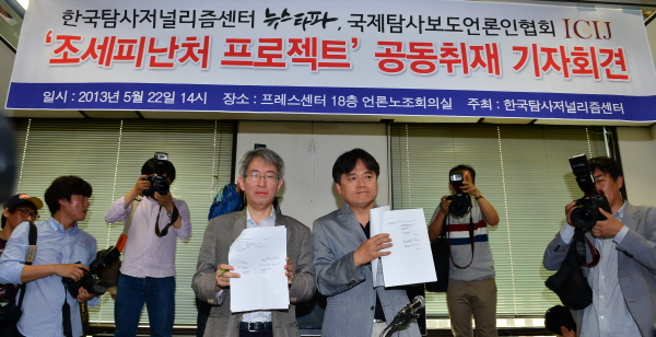 | ▲ 【서울=뉴시스】조종원 기자 = 지난 22일 오후 서울 중구 한국언론회관 전국언론노동조합 대회의실에서 열린 '조세피난처 프로젝트' 공동취재 기자회견에서 김용진(왼쪽) 뉴스타파 대표와 최승호 뉴스타파 PD겸 앵커가 1차 결과물 발표 자료집을 들어보이고 있다. | ||