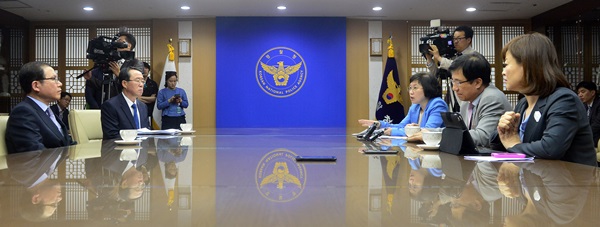 | ▲ 민주당 신경민 최고위원과 진선미, 김현 의원이 27일 서울 서대문구 경찰청을 방문해 국정원의 선거개입 사건과 관련해 이성한 경찰청장에게 항의하고 있다. (뉴시스) | ||