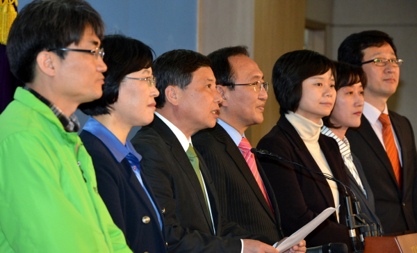 | ▲ 진보정의당이 사회민주노동당으로 당명 개정을 검토하고 있다. 사진은 국회 기자회견을 위해 모인 노회찬, 조준호 공동대표 등 진보정의당 지도부들.(뉴시스) | ||