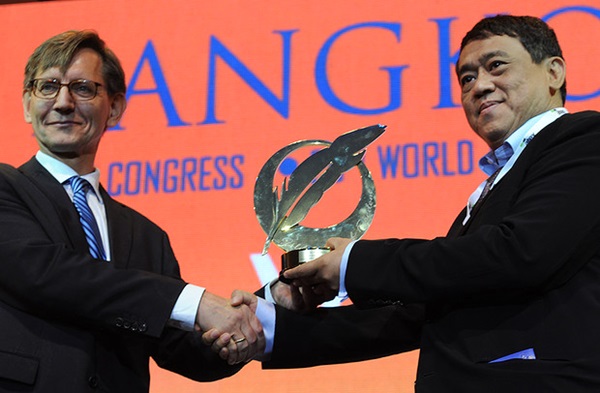 | ▲ 3일 태국 방콕에서 개막한 세계신문협회 총회에서 미얀마 일레븐 미디어 그룹 탄 후투 아웅(Than Htut Aung) 회장(오른쪽)이 황금펜상(Golden Pen of Freedom)을 수상했다. | ||