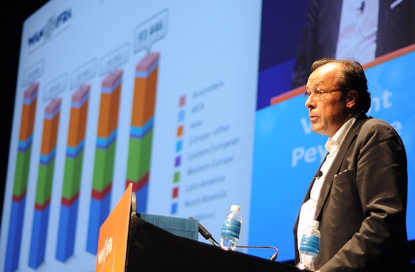 | ▲ 3일 태국 방콕에서 개막한 세계신문협회 총회에서 빈센트 WAN-IFRA CEO가 2013년 미디어 동향에 대해 발표하고 있다. | ||