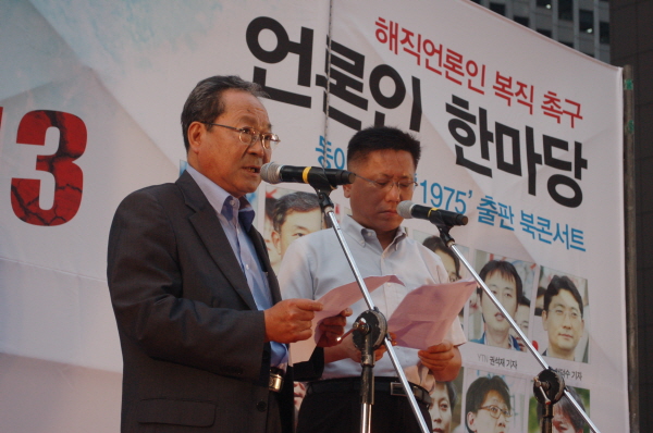 동아일보 사옥을 등지고 단상에 선 김종철 동아투위위원장은 “1975년 해직 당시 30대 초반이었던 기자들이 70대가 되고 당시 차장이던 윤완식 선배는 81세가 되셨다”며 “38년이 지나도록 역대 어느 정부도 복직과 명예회복을 시키지 못했다”고 말했다.