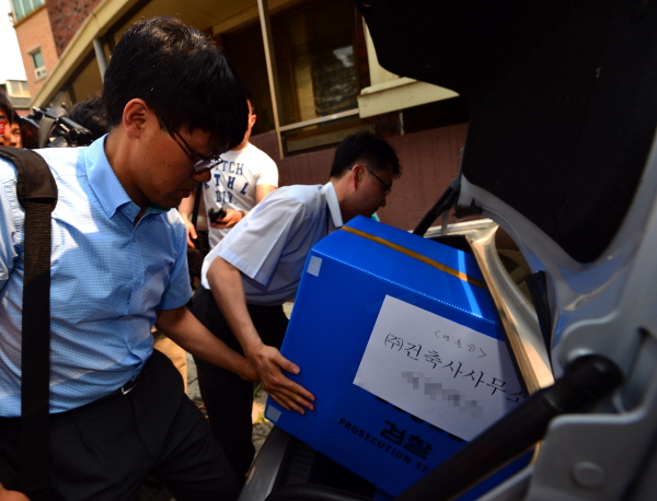 | ▲ 영훈국제중학교 입시 비리 사건을 수사 중인 검찰이 학교와 부당한 수의계약을 맺고 공사한 의혹이 제기된 건설업체 등 9곳을 압수 수색하는 가운데 지난 5일 오후 서울 종로구 혜화동 한 건축사무소에서 압수 수색을 마친 검찰이 확보된 자료를 이송하고 있다. (사진 뉴시스) | ||