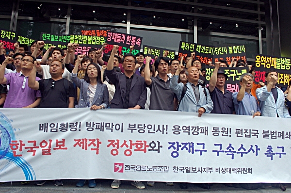 강성남 언론노조 위원장은 기자회견에서 “1975년 동아투위 이후 무력으로 편집국에서 쫓겨난 것은 처음”이라며 “사주의 이익을 위해 한국일보가 자살행위를 했다”고 비난했다. 또 강 위원장은 “편집국은 사회정의를 배우는 곳인데 사주가 폭력을 동원한 일은 있을 수 없는 일”이라며 “언론노동자들과 연계해 끝까지 싸우겠다”고 말했다.