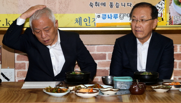 | ▲ [서울=뉴시스] 박동욱 기자 = 황우여 새누리당 대표와 김한길 민주당 대표가 18일 오전 서울 여의도의 한 콩나물국밥집에서 만나 6월 임시국회 방향에 대한 조찬회동의 자리에서, 김 대표가 국정원 선거개입 사건에 대한 박근혜 대통령과 여당의 태도변화를 촉구한 뒤 잠시 어색한 침묵이 흐르고 있다. | ||