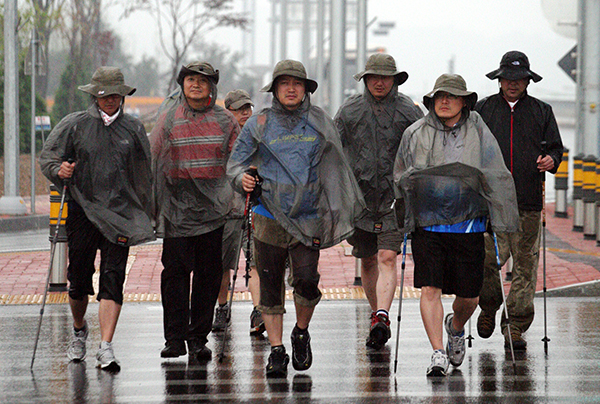 ▲ 지난 10일부터 ‘미디어 피폭지’ 국토순례에 나서고 있는 YTN 해직기자들이 15일 삼성전자 온양공장을 방문한 뒤 악천후 속에 다음 행선지인 광주 5·18묘역으로 행진하고 있다. 왼쪽부터 노종면·우장균·정유신·권석재·조승호 기자.(사진=YTN 노조)