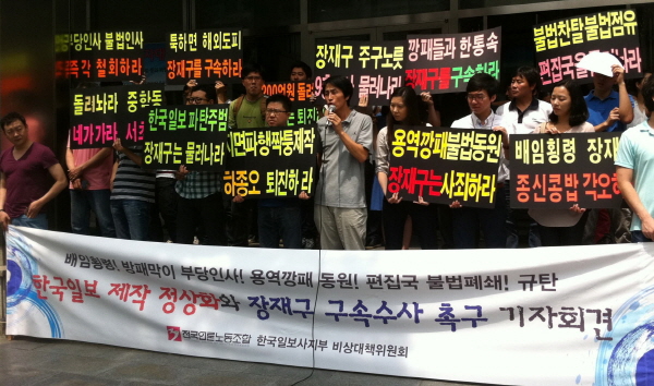 한국일보 노조 비대위는 20일 오전 서울 중구 한진빌딩 본관 앞에서 기자회견을 열고 “이제는 사설까지 연합뉴스 시론을 그대로 옮겨 쓰고 있다”며 “장재구 회장이 한국일보를 사유화하고 있다”고 말했다.