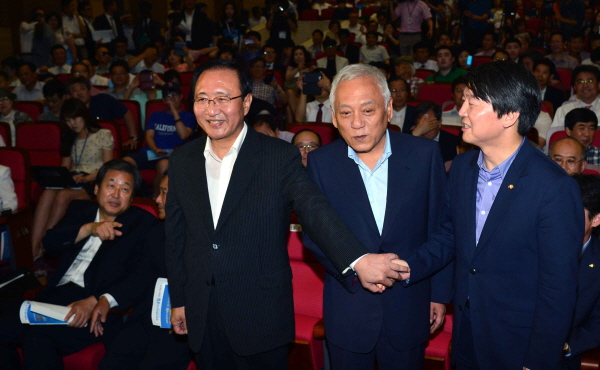 | ▲ 【서울=뉴시스】권주훈 기자 = 19일 오후 서울 여의도 국회 의원회관 대강당에서 무소속 안철수 의원이 싱크탱크 '정책네트워크 내일' 창립기념 학술회를 개최한 가운데 안철수(오른쪽부터) 의원과 김한길 민주당 대표, 노회찬 진보정의당 공동대표가 손을 잡고 있다. | ||