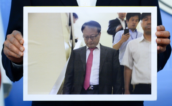| ▲ 【서울=뉴시스】박동욱 기자 = 정청래 정보위원회 민주당 간사를 비롯한 위원들이 20일 오후 서울 여의도 국회 정론관에서 서상기 정보위원장 등 새누리당 정보위원들의 NLL포기 발언 관련 기자회견에 대한 반박 기자회견을 열고 "한기범 국정원 1차장이 새누리당 의원들에게만 발췌록을 공개했다"며, "새누리당 위원들이 봤다는 문건은 남북정상회담 진본이 아닌 왜곡하고 훼손한 내용"이라 발표하고 있다. 사진은 민주당 정보위원들이 공개한 국회 방문하고 나서는 한기범 국정원 1차장의 모습. | ||
