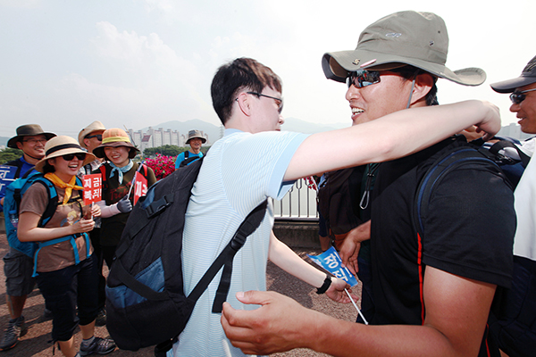 ▲ 23일 ‘공정방송 국토순례’ 11일째 경남 밀양에서 노종면 기자(오른쪽)와 해직기자들을 격려하기 위해 방문한 YTN 이대건 기자가 포옹하고 있다. (사진=언론노조) |