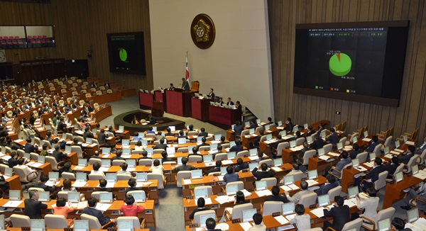 | ▲ 6월 임시국회 마지막날인 2일 오후 서울 여의도 국회 본회의장에서 열린 제316회 국회(임시회) 제10차 본회의에서 2007년 제2차 남북정상회담 회의록,녹음기록물 등 국가기록원보관 자료제출요구안을 투표에 부쳐 재적 300인,재석 276인, 찬성 257인, 반대 17인, 기권 2인으로 자료제출안이 통과되었다. (뉴시스) | ||