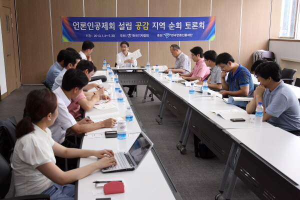 한국기자협회(회장 박종률)는 이날 오전 경남 창원시 의창구 창원시청에서 ‘언론인공제회 설립 공감 지역 순회 토론회’를 개최해 김진호 경남울산기자협회장을 비롯한 지회장 및 기자들과 언론인공제회에 대한 의견을 나눴다. 이 지역 순회 토론회는 3일 인천경기 지역에 이어 두번째다.