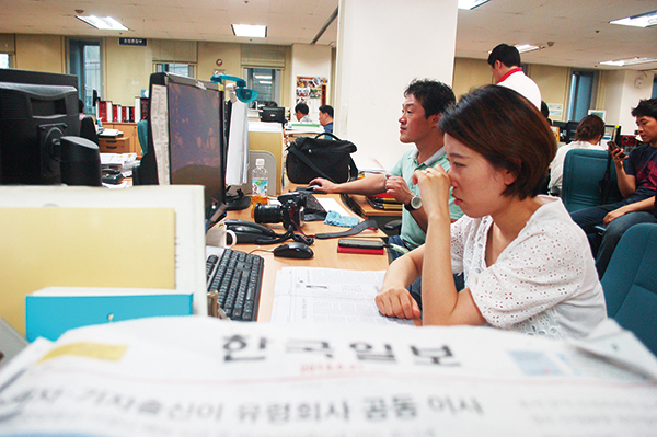 ▲ 9일 오후 폐쇄 조치가 해제된 한국일보 편집국에서 기자들이 자신의 개인 컴퓨터를 점검하고 있다. |