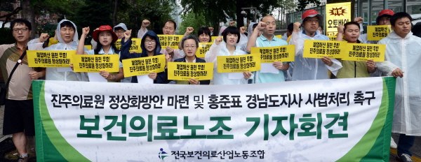 | ▲ 보건의료산업노조가 12일 오전 서울 여의도 국회 앞에서 진주의료원 정상화방안 마련 및 홍준표 경남도지사 사법처리 촉구 기자회견을 열고 구호를 외치고 있다. (뉴시스) | ||
