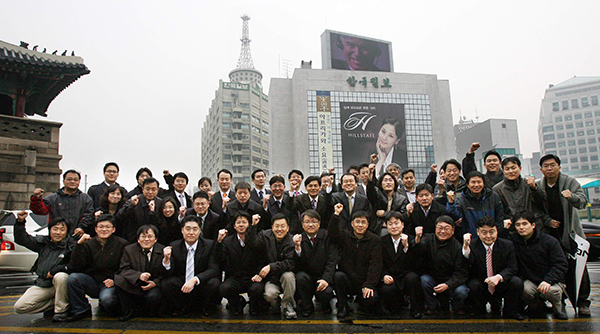 ▲ 2007년 2월 서울 중학동 옛 사옥 앞에서 한국일보 기자들이 마지막으로 기념 촬영을 하고 있다. 새 건물이 들어서면 다시 돌아올 수 있을 것이라는 기대가 장재구 회장의 우선매수청구권 포기로 무너지면서 장 회장에 대한 고발에 이르렀다는 게 한국일보 기자들의 설명이다. (사진=한국일보) |
