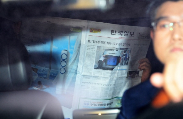 | ▲ 17일 검찰 조사를 마치고 차량에 올라탄 장재구 한국일보 회장이 신문으로 얼굴을 가린 채 앉아있다.(사진=한국일보 비상대책위) | ||