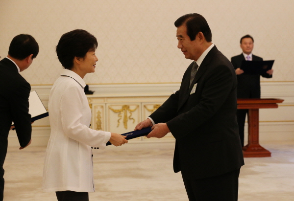 ▲ 박근혜 대통령이 8일 오후 청와대에서 한광옥 국민대통합위원장에게 위촉장을 수여하고 있다.(사진=뉴시스) |