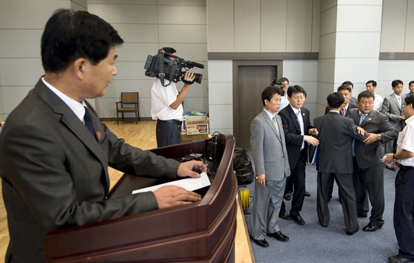 | ▲ 제6차 개성공단 남북당국실무회담을 마친 25일 회담장인 개성공단 종합지원센터 남측 기자실에서 북측 수석대표인 박철수 중앙특구개발지도총국 부총국장이 긴급 기자회견을 하자 남측 대표단이 이를 제지하려 하고 있다. (뉴시스) | ||