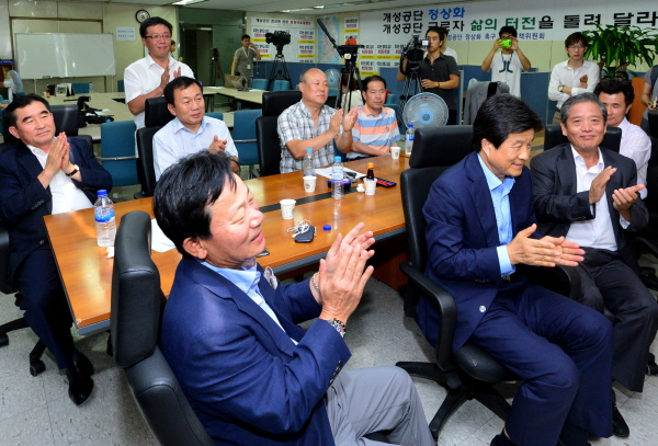 | ▲ 서울=뉴시스】박문호 기자 = 북한이 7차 개성공단 실무회담을 제안한 7일 오후 서울 영등포구 여의도 중소기업중앙회 개성공단입주자 사무실에서 한재권, 문창섭 개성공단 비대위 대표공동위원장 등 입주자들이 통일부의 "남북 당국 간 회담은 북한이 제의한데로 17일 개성에서 개최하기로 한다.'는 발표에 박수를 치며 안도의 한숨을 내쉬고 있다. | ||