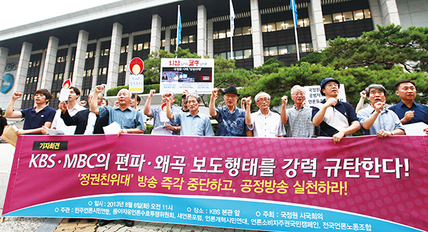 ▲ ‘공정보도’를 위한 싸움은 아직 끝나지 않았다. 국정원 시국회의가 지난 6일 여의도 KBS 본관 앞에서 기자회견을 열고 KBS와 MBC의 국정원 대선 개입 사건 보도 행태를 규탄하는 구호를 외치고 있다. (사진=언론노조) |