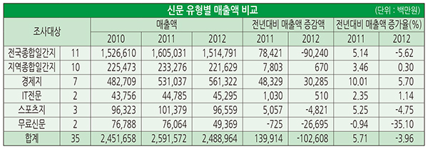 35개 신문기업들은 전년대비 3.96% 성장을 통해 총 2조4890억원의 매출을 기록했다(표 참조). 경제지(5.70%)와 IT전문지(1.14%)를 제외한 나머지 유형의 신문들은 모두 마이너스 성장을 했다.