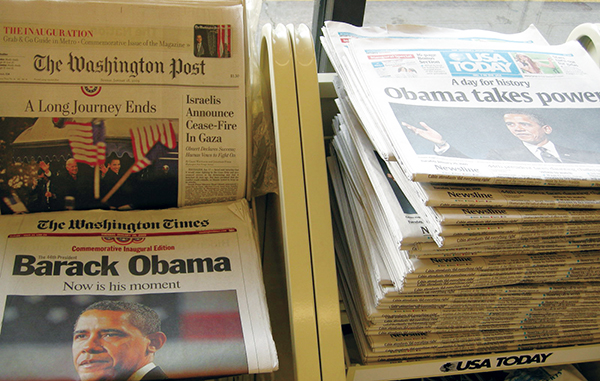 ▲ 미국 신문들이 뉴스유료화를 실시하는 등 세계적 흐름 속에 국내 신문들도 뉴스유료화에 나서고 있다. 사진은 2009년 1월 버락 오바마 새 미 대통령의 취임일 워싱턴 DC 가판대에 깔린 미국 신문들. (뉴시스) |