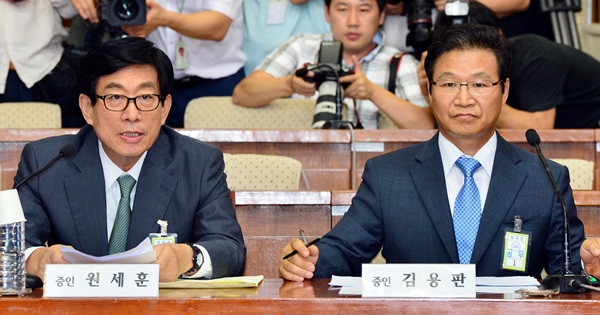 | ▲ 16일 서울 여의도 국회에서 열린 국정원 대선개입 의혹 진상규명 국정조사 청문회에서 원세훈(왼쪽) 전 국정원장과 김용판 전 서울지방경찰청장이 증인으로 출석해 질문에 답하고 있다. (뉴시스) | ||