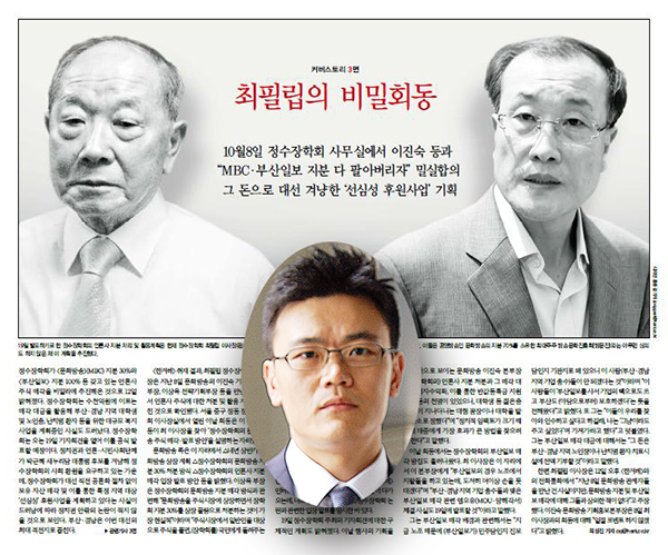 ▲ 최필립 전 정수장학회 이사장과 이진숙 전 MBC 기획홍보본부장 등의 MBC 지분매각 비밀회동을 보도한 지난해 10월 13일자 한겨레 지면. 원 안은 이를 보도한 한겨레 최성진 기자. |