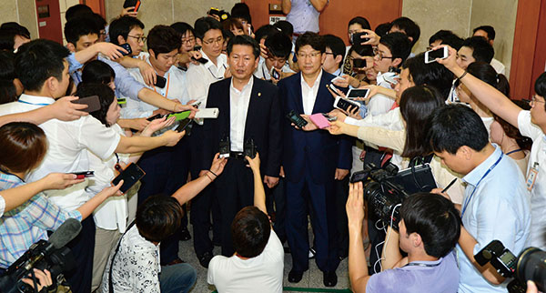 | ▲ 지난달 5일 서울 여의도 국회 정론관에서 ‘국가정보원 국정조사특위’를 앞두고 권성동 새누리당 간사(오른쪽)와 정청래 민주당 간사가 기자회견을 마치고 취재진의 질문에 답하고 있다.국정원 댓글 사건을 최초보도한 기자는 국정원 직원에게 고발당했다.(뉴시스) | ||