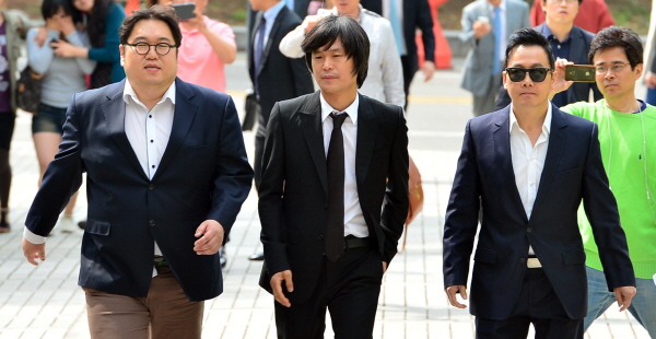 | ▲ 【서울=뉴시스】조종원 기자 = 박근혜 대통령의 5촌 조카 사망 사건 의혹을 보도해 사전구속영장이 청구됐던 주진우 시사IN 기자가 지난 5월14일 영장실질심사가 열린 서울 서초구 서초동 중앙지방법원으로 정봉주씨, 김용민씨와 함께 들어서고 있다. | ||