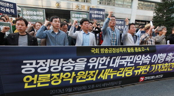 | ▲ 전국언론노조가 26일 여의도 새누리당사 앞에서 공영방송 지배구조 개선과 관련한 대통령 공약 이행을 촉구하는 기자회견을 열었다. (언론노조) | ||