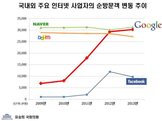 유승희 의원은 14일 국정감사에 앞서 배포한 보도자료를 통해 “구글이 2009년 순방문자 기준 50위에서 2013년 2위로 급등하며 네이버를 목전에서 위협하고 있다”고 밝혔다.
