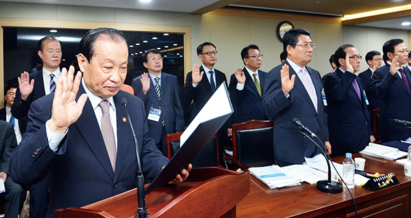 ▲ 15일 오전 방송통신위원회 국정감사가 열린 경기도 정부과천청사에서 이경재 방통위원장과 관계자들이 선서를 하고 있다. (뉴시스) |
