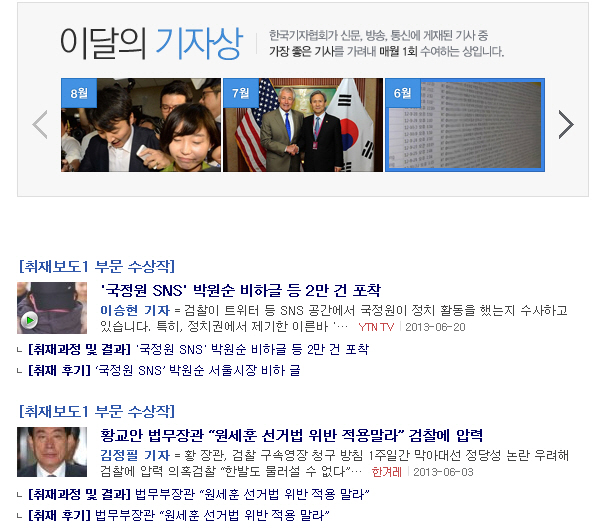 네이버 뉴스는 핫이슈 코너를 통해 우선 2013년 1월부터 ‘이달의 기자상’을 수상한 기사들을 보여주고, 취재 과정과 후기 및 유료화 기사 서비스 등 최신 언론사 동향에 관한 다양한 이야기들도 소개할 예정이다.